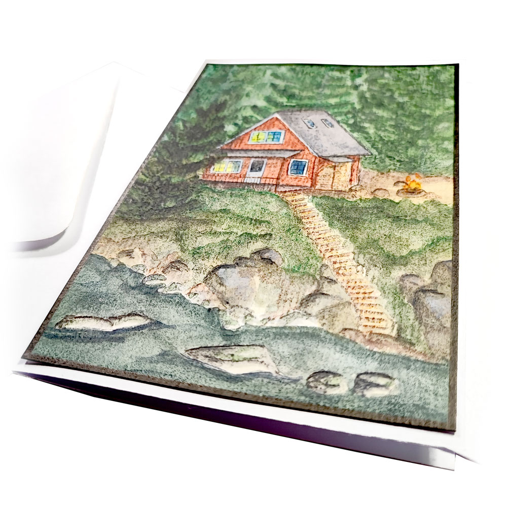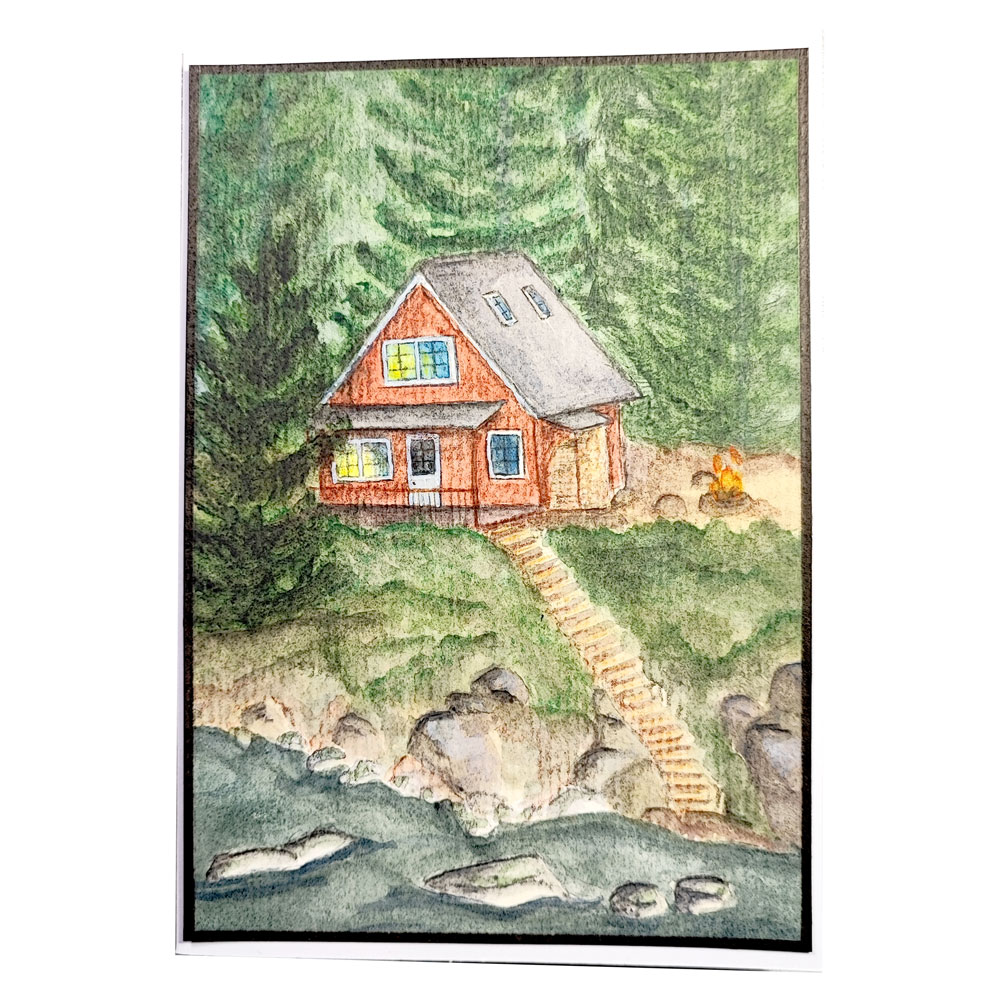 Ein Hauch von nordischer Geborgenheit und die stille Sehnsucht nach einem Rückzugsort in der Wildnis vereinen sich auf dieser handgemalten Aquarellkarte zu einem Moment purem Skandinavien-Glücks. Das malerische Motiv zeigt ein klassisches Schwedenhaus im typischen Falu-Rot, das erhaben auf einem Uferhang thront, während das warme Leuchten in seinen Fenstern und ein prasselndes Lagerfeuer eine einladende Zuflucht inmitten der rauen Natur versprechen. Über eine lange, hölzerne Treppe gelangt der Blick hinunter zum glitzernden Wasser und den markanten Ufersteinen, meisterhaft eingerahmt von der tiefgrünen Tiefe eines dichten Tannenwaldes – handillustriert mit lichtechten Pigmenten auf 300g/m² Künstler-Aquarellpapier.
